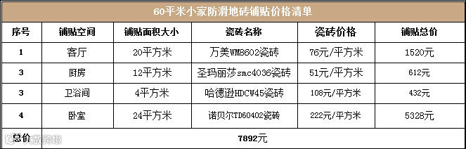 小编总结:60平米的空间,8000块钱,可能有些小伙伴觉得太贵了。不过仔细看上面的价格清单,我们发现花费主要在卧室空间上。的确小编推荐的这款卧室瓷砖格调是稍微 高了点,但如果你对睡眠环境要求较高,千万不能将就。再整体看这套方案,它最大的特点就是比较人性化,考虑到了各种需求。首先,防滑效果是不必说的了。另 外,在客厅,我们考虑了它的美观性;厨房考虑了它的耐污性;浴室考虑了它要拓展空间的需求;卧室则考虑了光线的要求。当然可能还有些考虑不到的地方,小伙 伴们仅当一个参考吧!