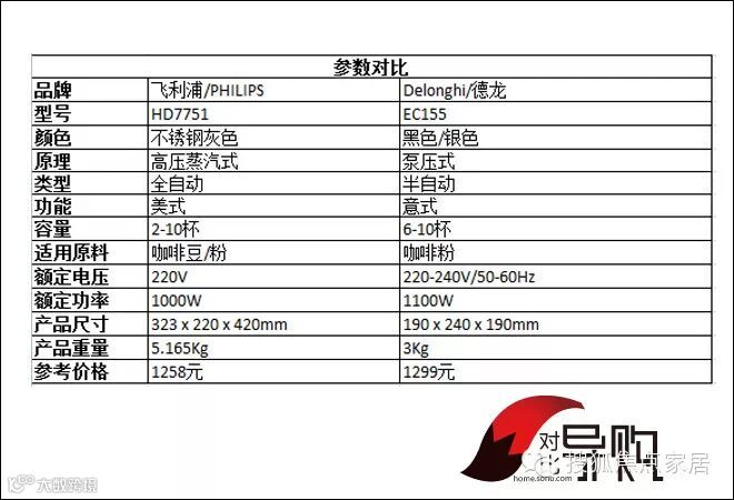 虽然两款咖啡机都是蒸汽式的,但两者还是有差异的,飞利浦Philips HD7751是美式全自动研磨一体化的,德龙Delonghi EC155是泵压意式半自动的。前者只需将咖啡豆或粉放入机器,一键就可以完成咖啡的制作,后者则需要将咖啡粉和水放入机器,再进行操作。此外,飞利浦这款可以豆粉两用,德龙则可以冲调卡布奇诺咖啡。