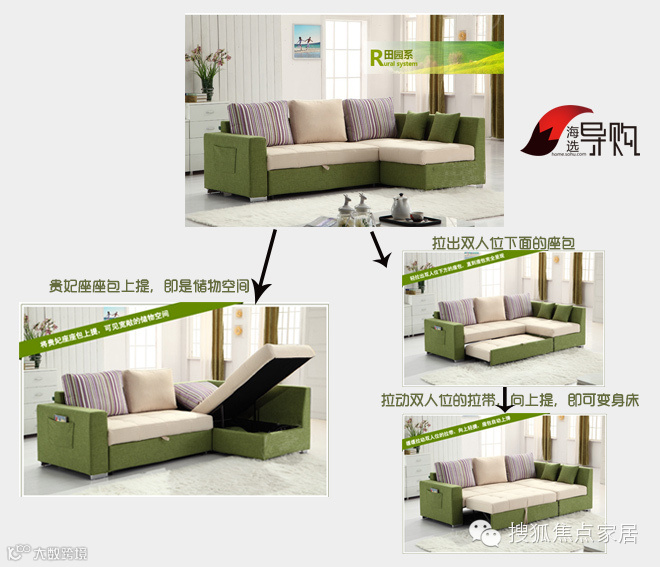 这款沙发侧面带有置物袋,可以放置书刊杂志,方便在沙发上取阅。沙发的贵妃座提起来,下面就是储物空间,可以放抱枕、被子之类的物品。找到双人座下面隐藏的提带,将双人座拉出,再向上提,又可以变成一个255cm*157cm*75cm的大床,非常方便,功能很多。