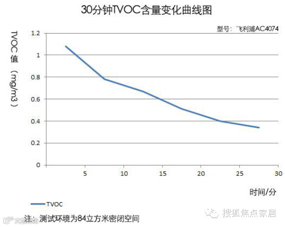 在2分钟的时候,空气中TVOC的含量约为1mg/m3,经过20分钟运行后,空气中TVOC的含量为0.74。