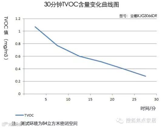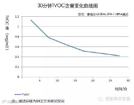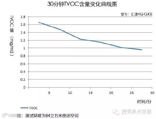 大概约23分的时候,空气中的TVOC含量约为1mg/m3,再继续经过20分钟后,空气中的TVOC含量为0.85(曲线图中没有汇出)。