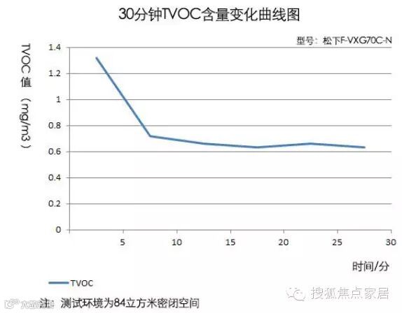 同样,在5分钟左右,空气中TVOC的含量约为1mg/m3,再经过20分钟运行后,空气中TVOC的含量为0.47。