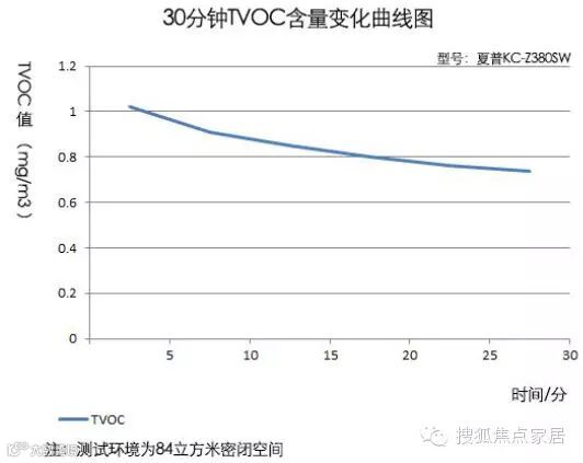 在大概4分钟的时候,空气中TVOC的含量约为1mg/m3,再经过20分钟运行后,空气中TVOC的含量降为0.31。