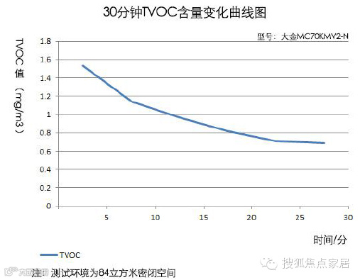 在大概12分钟的时候,空气中TVOC的含量约为1mg/m3,再经过20分钟后,空气中TVOC的含量为0.65。