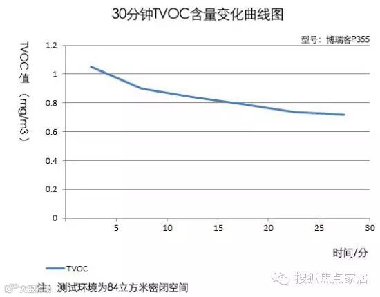 在大概4分钟的时候,空气中TVOC的含量降为1mg/m3,经过20分钟后,空气中TVOC的含量为0.30。