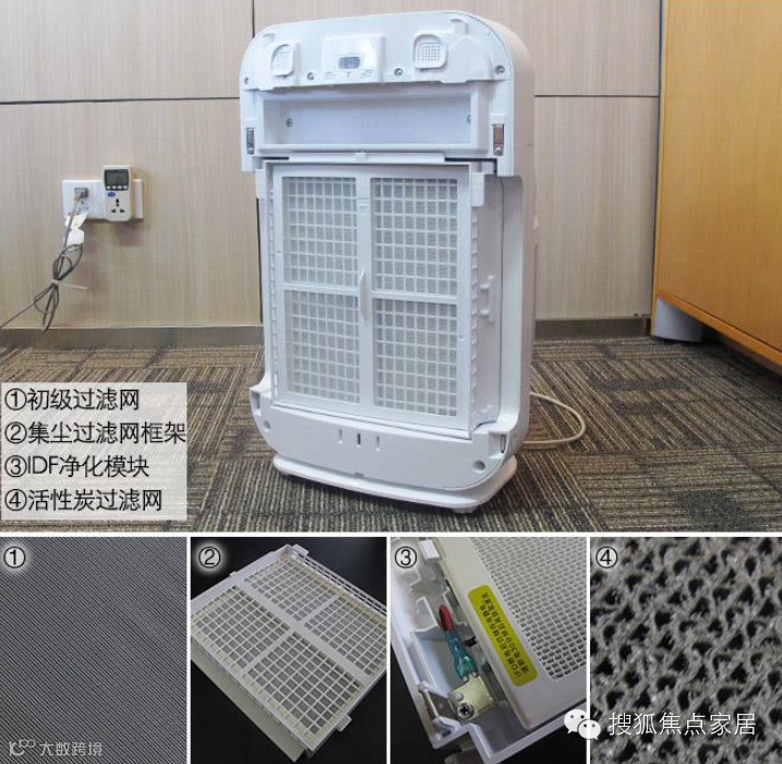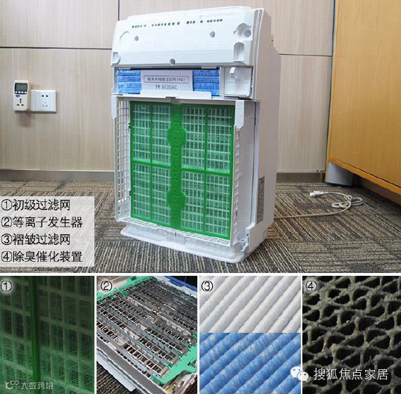 过滤网:四层(前置过滤网/脱臭过滤网/除甲醛过滤网/集尘过滤网)功能:净离子群空间净化技术、加湿
