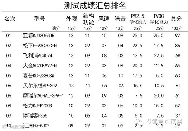 评测项目和比重:外观细节(15)、结构功能(15分)、风速(10分)、噪音(10分)、PM2.5净化能力(25分)、TVOC净化能力(25分)
