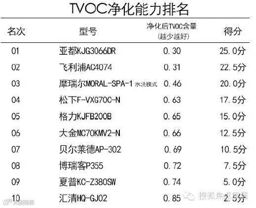 在TVOC净化能力上面,通过对比,可以看出,从第一到第十名分别为亚都KJG3066DR、飞利浦AC4074、摩瑞尔MORAL-SPA-1(水洗模式)、松下F-VXG70C-N、格力KJFB200B、大金MC70KMV2-N、贝尔莱德AP-302、博瑞客P355、夏普KC-Z380SW以及汇清HQ-GJ02。其中,前两名的表现尤为突出,大幅度的领先对手。