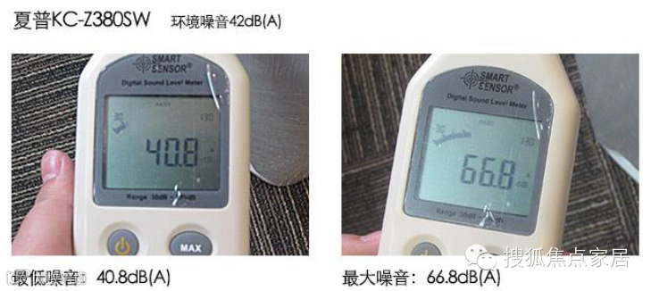 实测夏普KC-Z380SW的最低噪音为40.8dB(A),基本就是环境噪音;最大噪音为66.8dB(A),噪音值也不高,表现十分优秀。