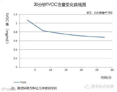 在5分钟左右时,空气中TVOC的含量降为约1mg/m3,再继续运行20分钟后,空气中TVOC的含量降为0.46。