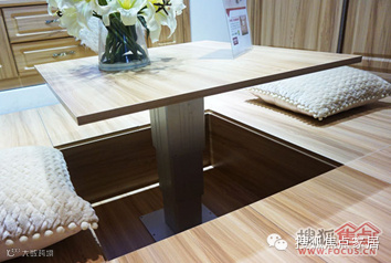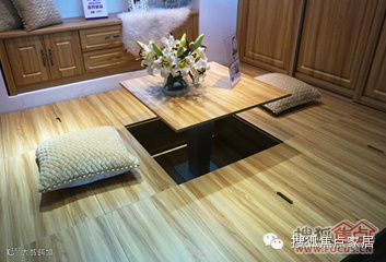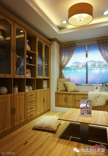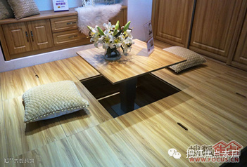 正中间设置成榻榻米,但与日本的榻榻米又有一点区别:日本的榻榻米是没有升降桌的,全部都是平的,然后在上面摆个实木桌,盘腿而坐;中式榻榻米考虑到消费者的习惯,在榻榻米中间还有个升降桌,围着升降桌坐的时侯,腿是可以放下去的,不需要盘腿。