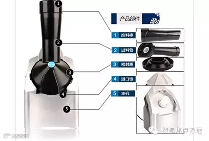 亿利来水果冰淇淋机由五个部分:推料棒、进料管、密封圈、道口锥和主机组成,进料装置和主机的组合通过卡扣式设计完成,其道口锥处采用六向多角度的不锈钢锯齿研磨刀。