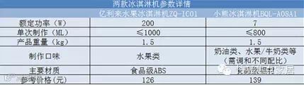 · 操作区别:亿利来冰淇淋机需要将水果冷冻较长时间后,以“做二休一”的方式(制作2分钟停1分钟)完成;小熊冰淇淋机需要将冷冻桶部分冰冻较长时间后,根据所需的量配比制作混合液,一键式15-20分钟制作完成。
