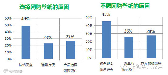 对于消费者来说,网购墙纸的优惠价格带来的吸引力占到了49%,消费者对价格非常敏感,这是对商家的一种警告:网上的墙纸产品一旦失去价格优势,就极有可能失去半数消费者。
