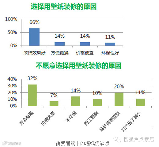 墙纸的缺点同样突出。32%的消费者认为,墙纸的寿命有限是其致命伤;其次,维护清理麻烦也受到了20%消费者的诟病。