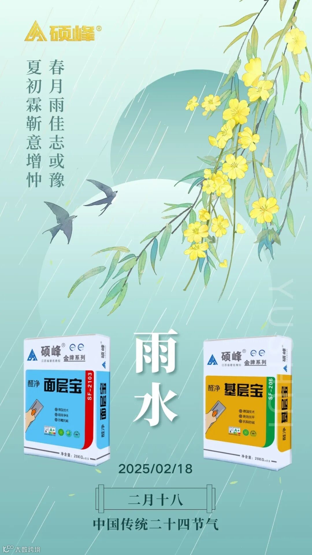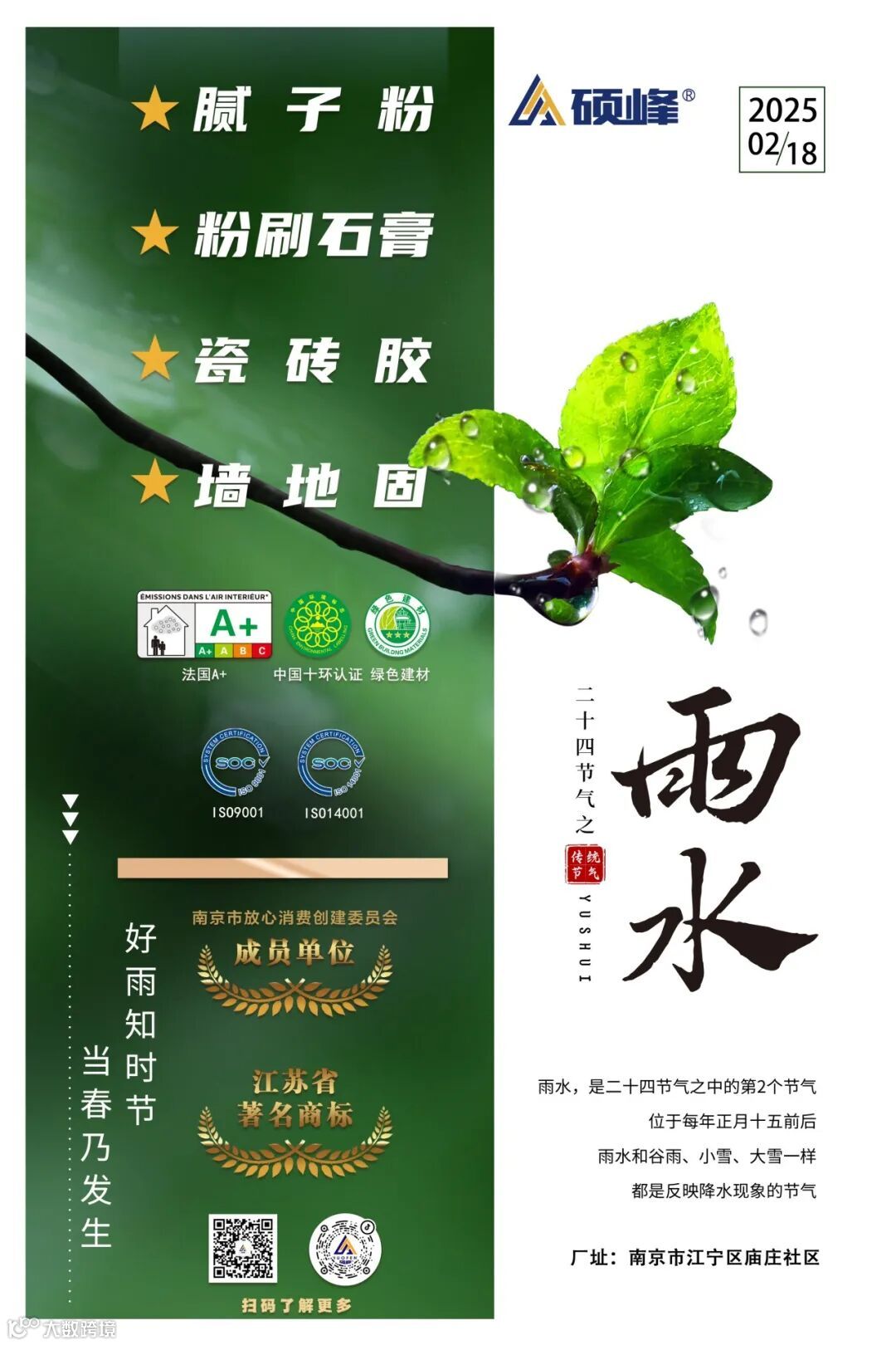 雨水至,湿气重。当春雨带来潮湿空气,墙面易受潮发霉、空鼓脱落,影响家居美观与健康。硕峰专注腻子粉研发,以卓越防水性能,为您的墙面筑起坚实防护,让家持久如新!