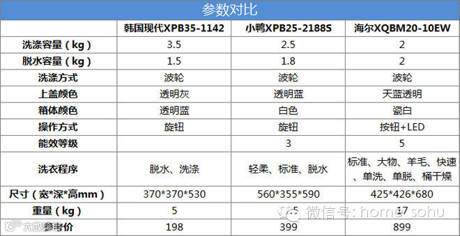 其实除了省空间之外,对于有宝宝的家庭,迷你洗衣机很适合用来专门给宝宝的衣物做清洁,所以现在越来越多的迷你洗衣机品牌都打出了“家中第二台”或是“婴儿洗衣机”这样的口号。本次要给大家推荐的三款迷你洗衣机分别是:韩国现代XPB35-1142半自动迷你洗衣机、小鸭XPB25-2188S双缸半自动洗衣机、海尔XQBM20-10EW迷你全自动洗衣机,一起先来看一下他们的参数。