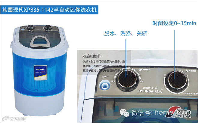 言归正传,作为主打婴儿洗衣机的一款产品,它真的非常小,体积只有370*370*530mm,小朋友随便长一长就超过这个高度了。而洗涤容量却高达3.5kg,这在迷你洗衣机中已经相当大了。韩国现代XPB35-1142由两个旋钮控制洗涤,功能也十分简单,一看就会。
