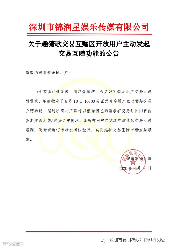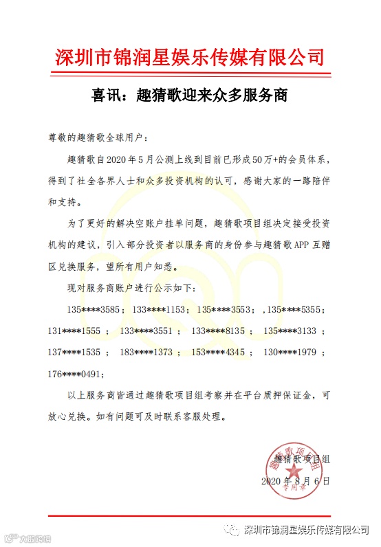 8月6日,为方便用户交易互赠,趣猜歌项目组引入服务商机制,并公布服务商名单,确定每日10:00-20:00为服务商服务时间;
