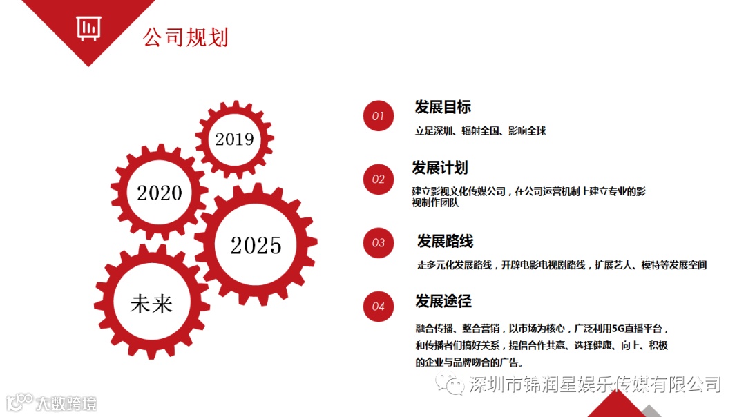 以投资创建文化产业、创编拍摄影视作品、承接运作文化项目、策划举办大型演出活动等系列项目,致力打造在全球范围内产生广泛影响的品牌综合力,全面提升公司价值引导力和文化品位,进一步完善以娱乐文化为基础的产业生态链。未来,锦润星将力争成为国际化、多元化、新闻化和时代性、社会性、领先性的全媒体娱乐内容供应商,并在此基础上,成为品牌化娱乐行销服务商。