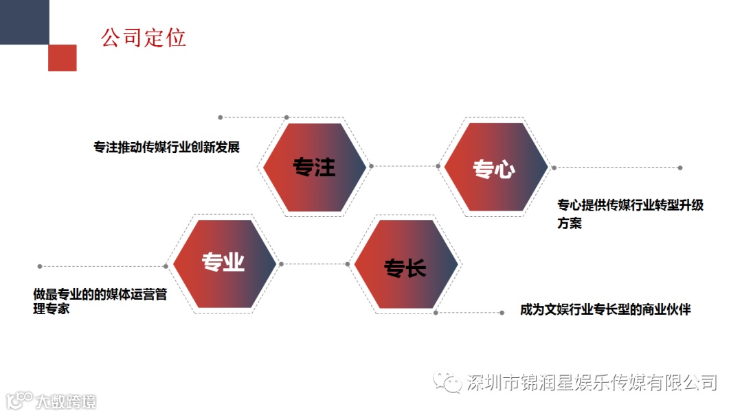 深圳市锦润星娱乐传媒有限公司(以下简称“锦润星” )是由中国香港、中国澳门及大陆等多地投资商在深圳共同携手创建。是一家集投资、策划、制作、宣传、软件开发等为主导的大型娱乐传媒综合型企业。
