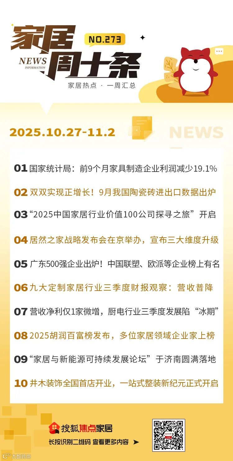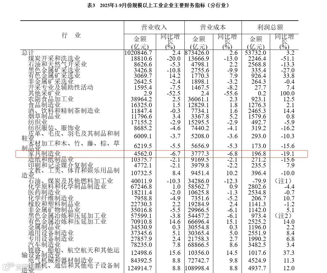 10月27日,国家统计局公布的数据显示,今年1至9月规模以上家具制造企业的营业收入为4562.0亿元,同比减少6.7%;营业成本为3777.3亿元,同比减少6.8%;利润总额为196.8亿元,同比减少19.1%。