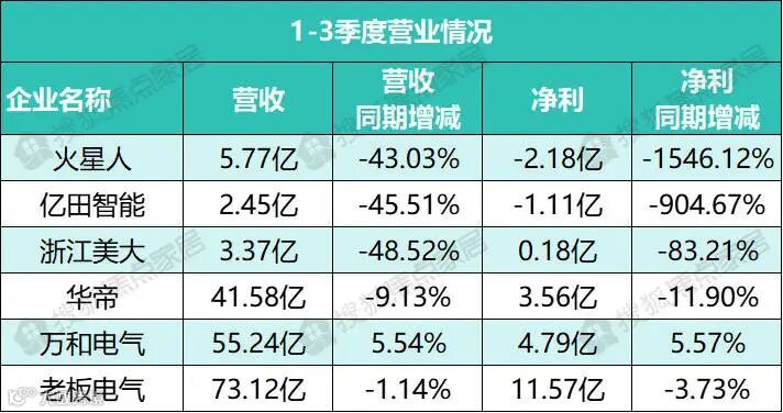 近日,火星人、亿田智能、浙江美大、华帝、老板电器、万和电气六家厨电行业上市企业发布三季度报告,5家企业在营收或净利端陷入下滑困局,仅1家实现微增,结合 1-3 季度及单三季度的经营数据,厨电企业的分化与行业困境愈发清晰。