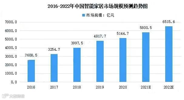数据显示,2016-2020年我国智能家居市场规模由2608.5亿元增至5144.7亿元,年均复合增长率为18.51%。因此,2022年我国智能家居市场规模可达6515.6亿元。未来,随着国内移动终端的普及和物联网的推广,预计智能家居发展将进一步提速,市场增长潜力巨大。