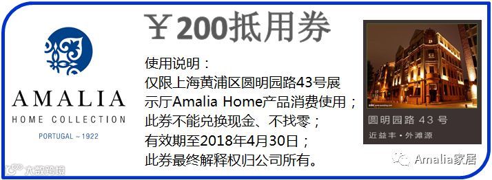 “设计上海”展结束后,很多意犹未尽的小伙伴们提出如何购买Amalia Home的床品。为感谢大家的捧场,Amalia Home在此为各位奉上价值200元的抵用券一张,小伙伴只需要在展厅挑选自己喜爱的产品,结账时出示下面的抵用券即可享受优惠!欢迎转发哦~