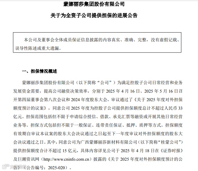 蒙娜丽莎:为广西子公司提供1亿元贷款担保