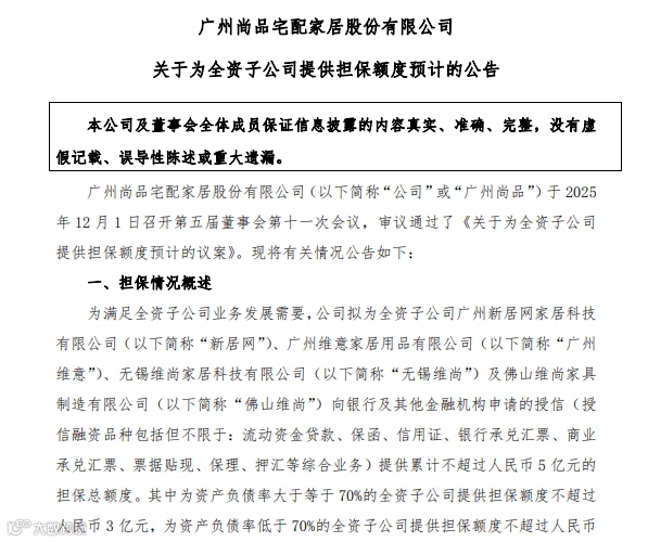 尚品宅配于12月1日发布公告,拟为旗下新居网、广州维意、无锡维尚、佛山维尚四家全资子公司向金融机构申请授信提供总额不超过5亿元的担保,并根据子公司资产负债率水平划分担保额度,该事项尚需提交股东大会审议。