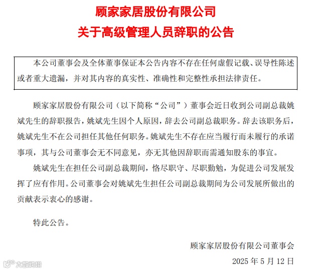 2025 年 5 月 12 日,顾家家居公告称收到副总裁姚斌的辞职报告,姚斌因个人原因辞去副总裁职务,且不再担任公司其他任何职务。姚斌于 1989 年 7 月出生,历任顾家家居股份有限公司床垫事业部总经理、电商事业部联席总经理、电商事业部总经理等职,自 2024 年 10 月起任顾家家居副总裁。顾家家居正值拓展市场份额的关键时期,高管的变动可能对公司的业务推进和团队稳定性产生一定影响。
