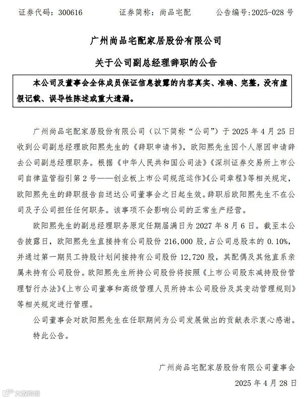 广州尚品宅配家居股份有限公司于2025 年 4 月 25 日收到副总经理欧阳熙的《辞职申请书》,欧阳熙因个人原因辞去公司副总经理职务,且辞职后不在公司及子公司担任任何职务。