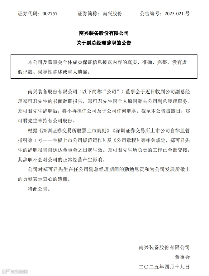 南兴装备股份有限公司董事会于近日收到公司副总经理郑可军的书面辞职报告,郑可军因个人原因辞去公司副总经理职务,且辞职后不再担任公司及子公司任何职务。郑可军1980 年出生,本科学历,2021 年 5 月起担任南兴股份副总经理等多职。南兴股份在郑可军离职后,其负责的数据中心战略业务等方面的工作交接已完成,只要公司核心技术和产品研发能力保持稳定,其在行业中的竞争力依然稳固。