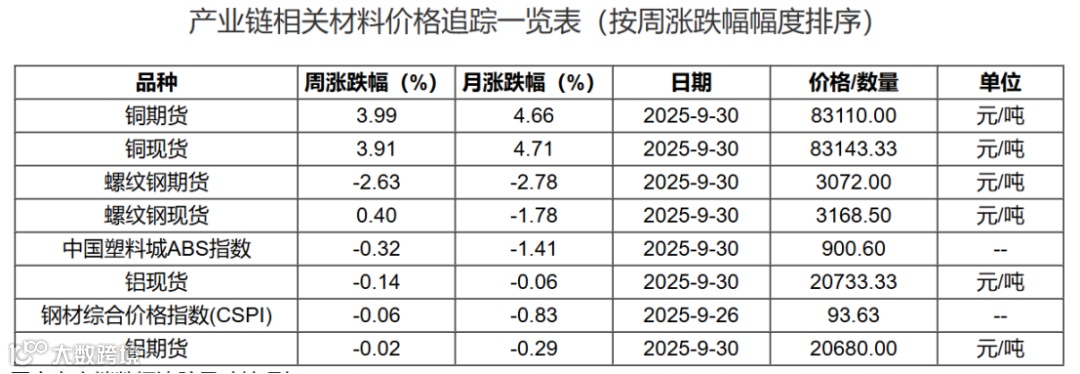 对家电、陶卫产品至关重要的铜,价格持续冲高:截至9月30日,铜期货价格达 83110.00 元 / 吨,周涨 3.99%、月涨 4.66%,年初至9月末累计涨了 18.5%。