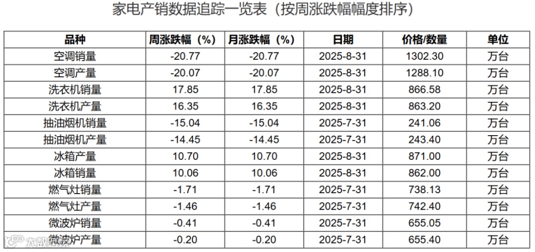 相比之下,洗衣机和冰箱板块成了家电行业的 “逆势增长代表”。8 月洗衣机产量 863.20 万台,周涨 16.35%,销量 866.58 万台,周涨 17.85%;冰箱产量 871.00 万台,周涨 10.70%,销量 862.00 万台,周涨 10.06%。业内人士分析,这两类产品受原材料涨价的影响相对较小,且消费者对健康、大容量机型的需求增长,支撑了产销数据。