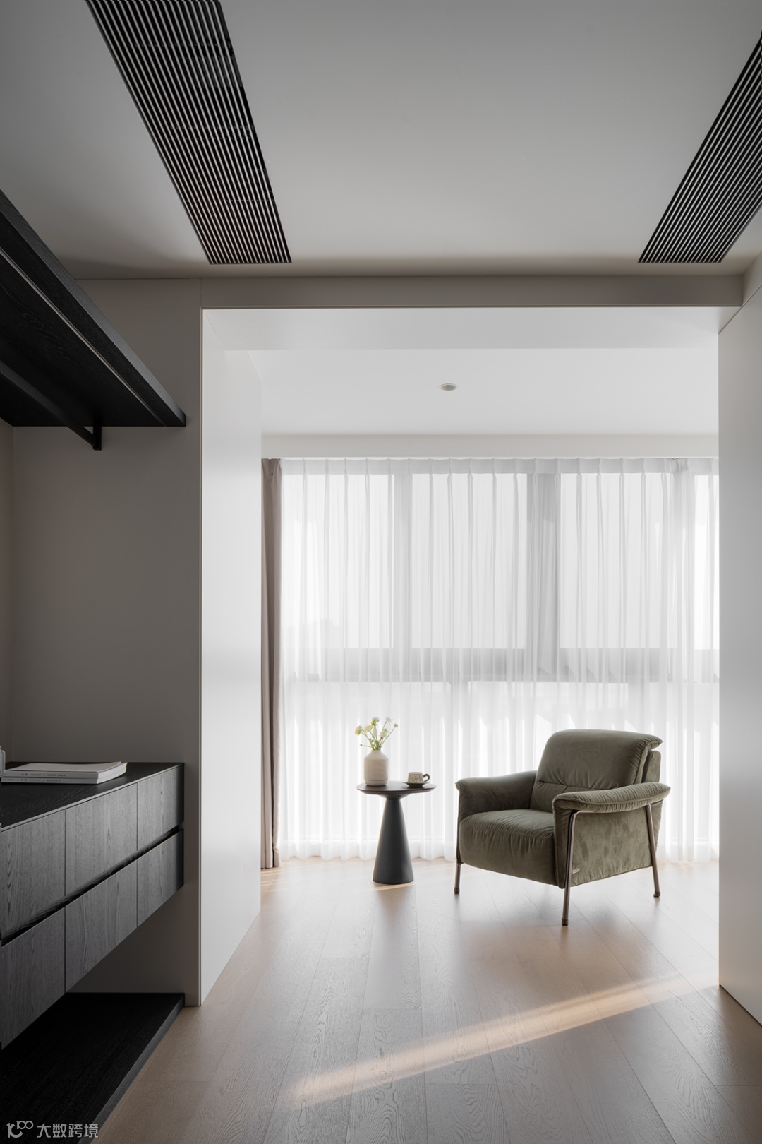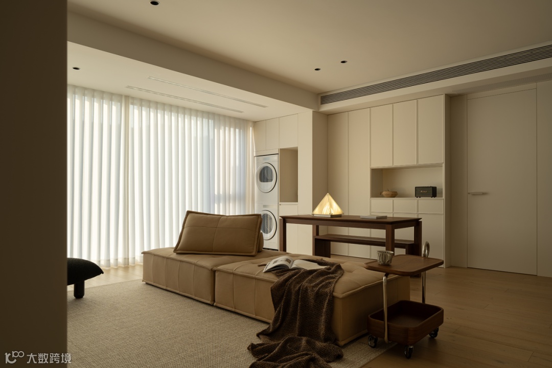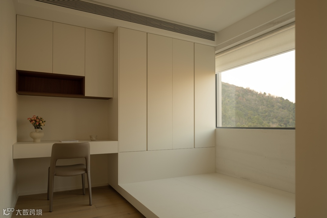 书房开放多功能需求,作为学习办公、小孩手工互动等应用。书桌与沙发区随空间层次微妙递进,立柜界面简约流畅,统一视觉的延续,与公共区构成整体框架。帘幔落下,仅一盏暖光就能感知日常中不易察觉的细节,加深生活厚度。