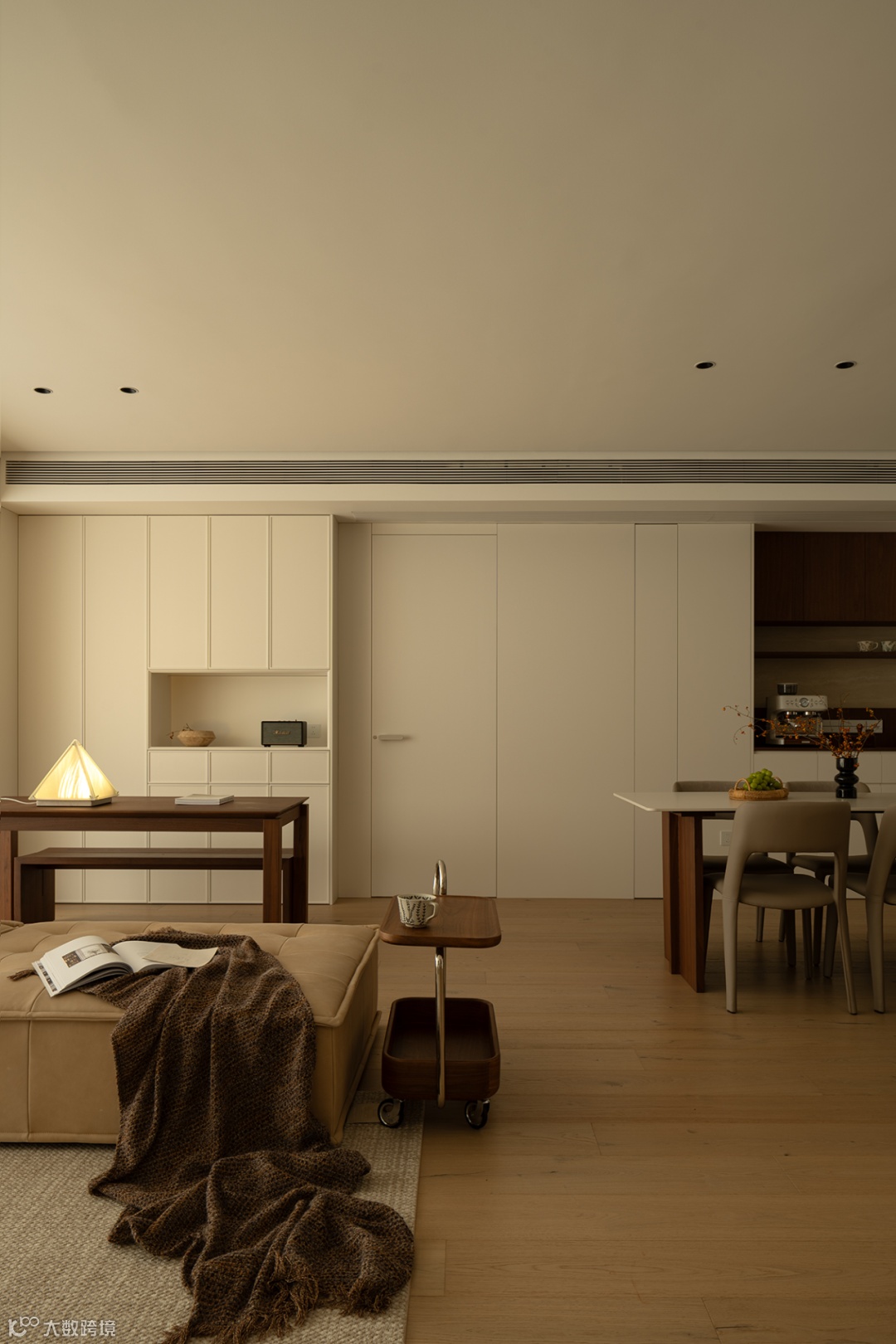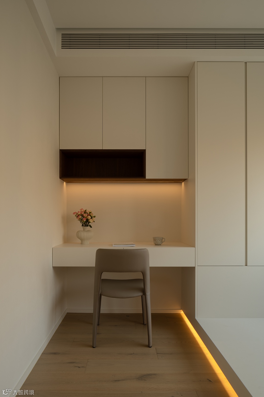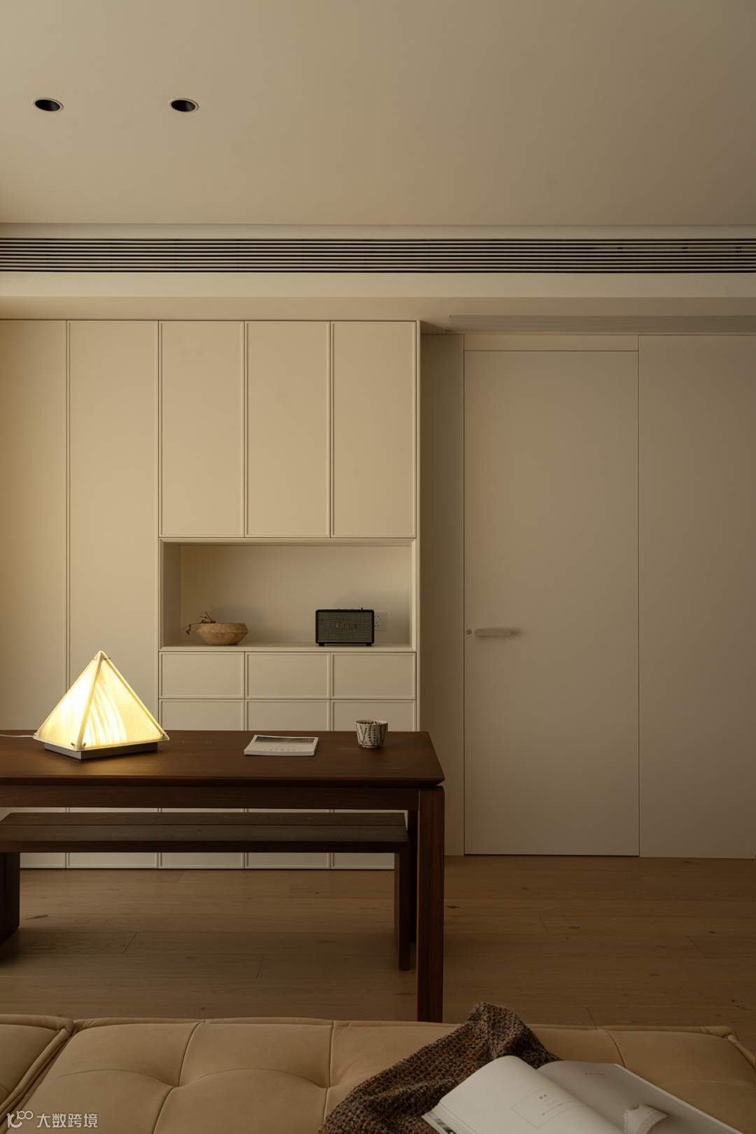 书房开放多功能需求,作为学习办公、小孩手工互动等应用。书桌与沙发区随空间层次微妙递进,立柜界面简约流畅,统一视觉的延续,与公共区构成整体框架。帘幔落下,仅一盏暖光就能感知日常中不易察觉的细节,加深生活厚度。