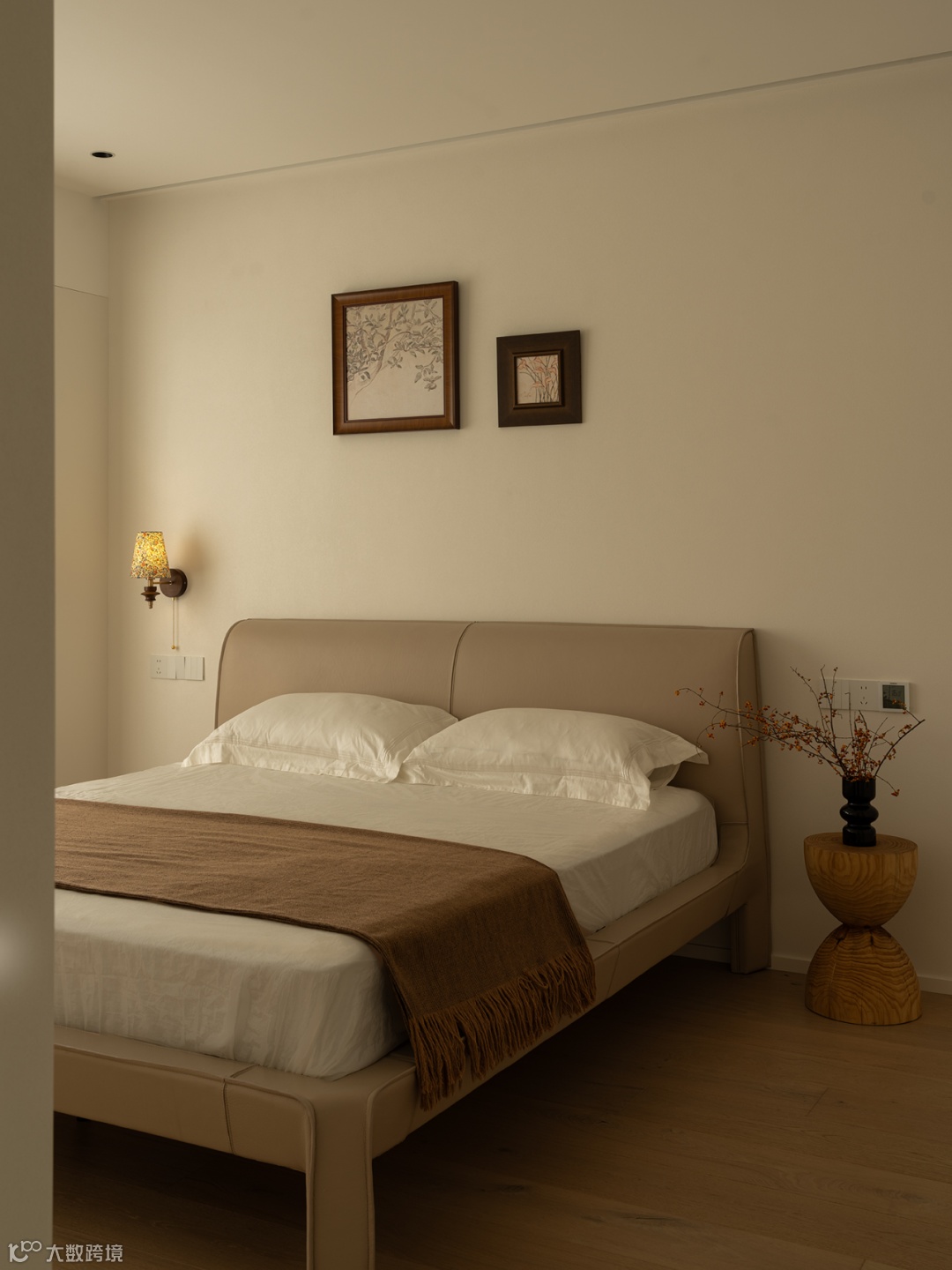 主卧以暖色调沉淀家居气质,温暖木质与润白肌理组合联系,描摹着流畅的空间骨架。软装家具以令人舒适的组合方式,体现空灵的流动意象,润物无声,跟随光的抚触,舒展自然呼吸。