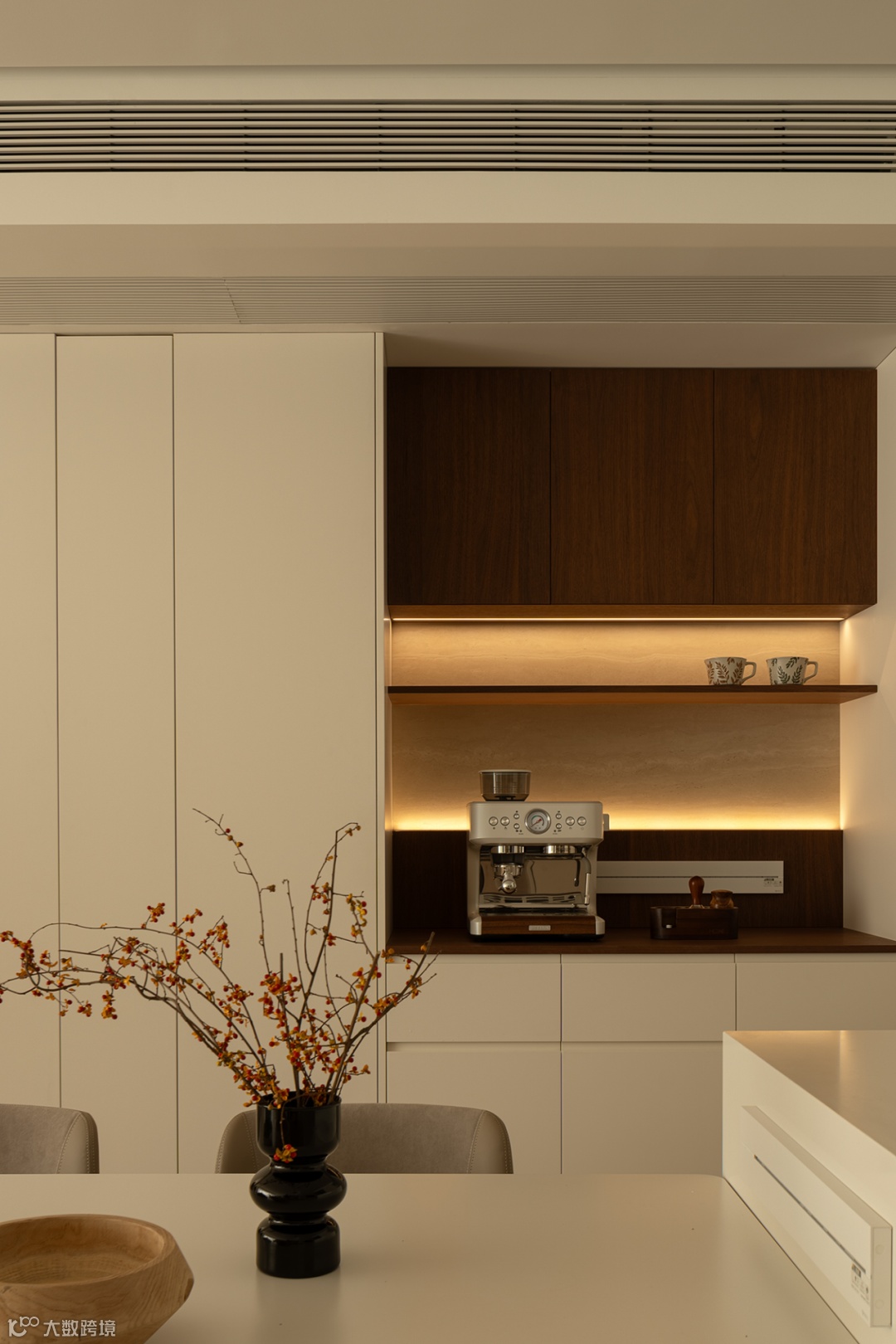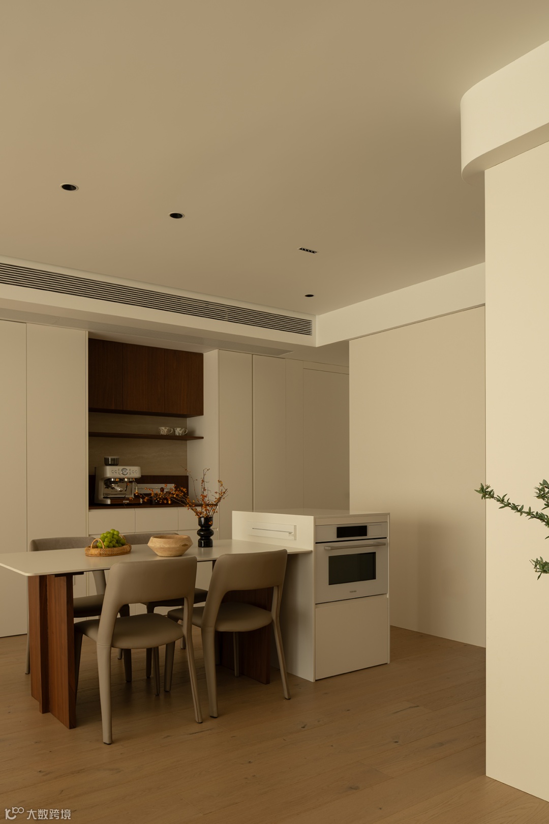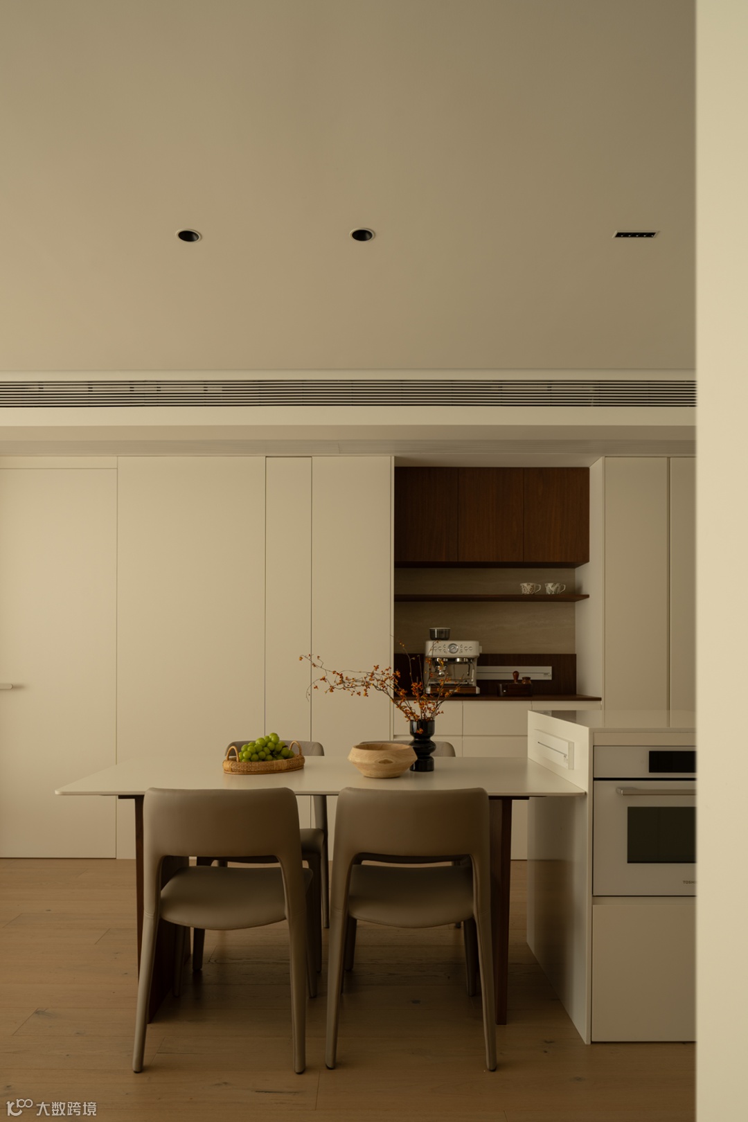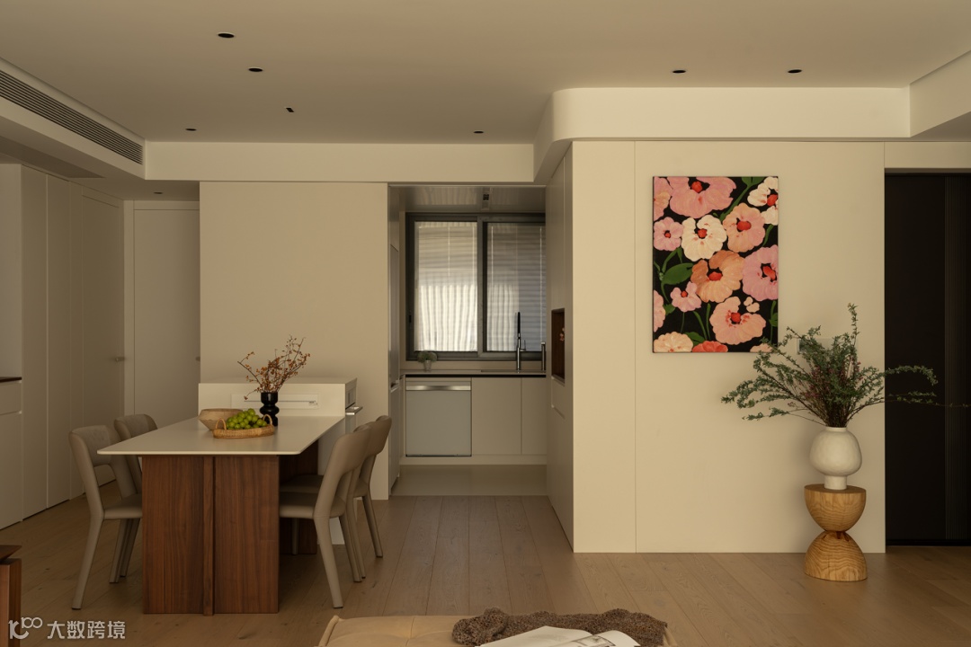 通过调度过道的比例关系,在岛台柜体中嵌入烤箱,同餐边柜搭配延伸西厨料理。闲暇时磨一杯咖啡,与友人小聚,生活滋味蔓延而生。