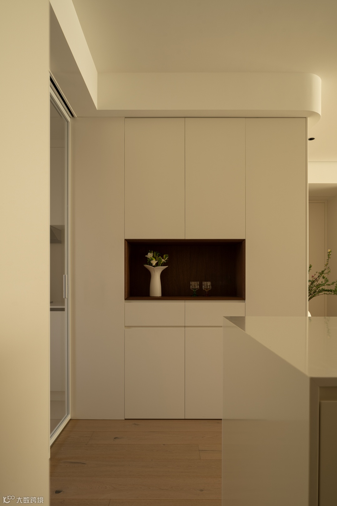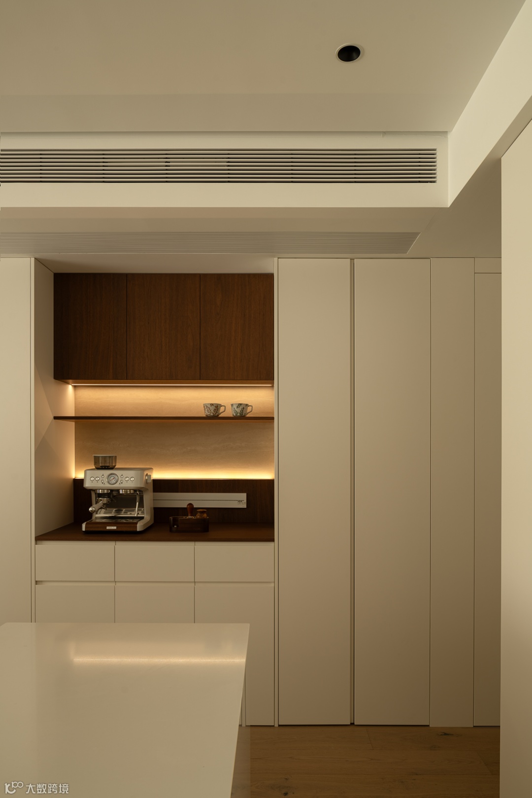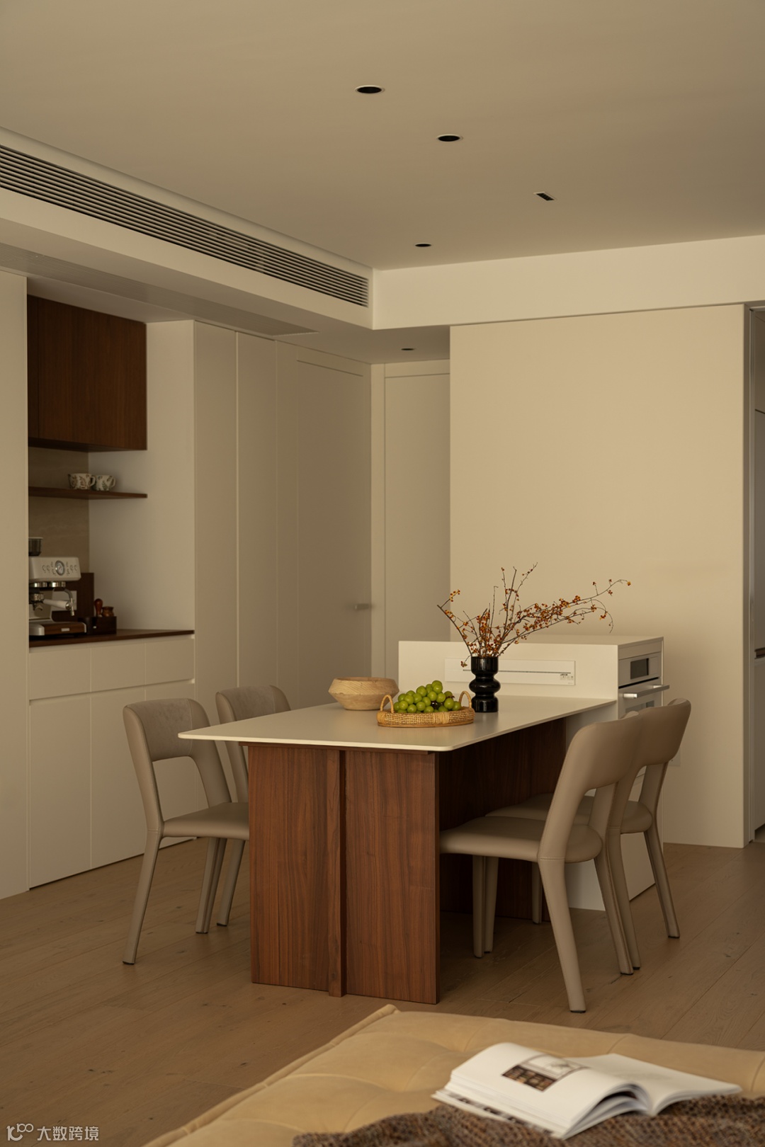 通过调度过道的比例关系,在岛台柜体中嵌入烤箱,同餐边柜搭配延伸西厨料理。闲暇时磨一杯咖啡,与友人小聚,生活滋味蔓延而生。