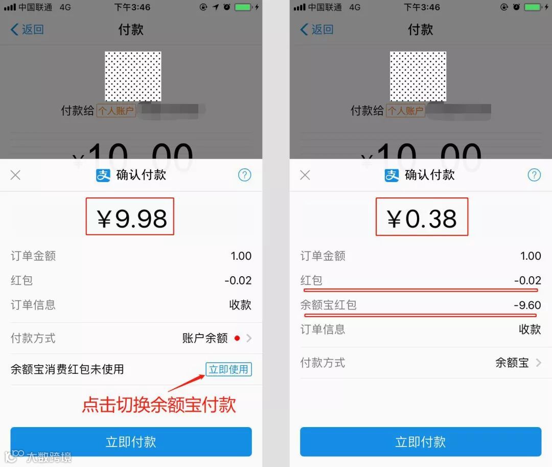 4.付款时选择余额宝付款即可以同时抵用两个红包: