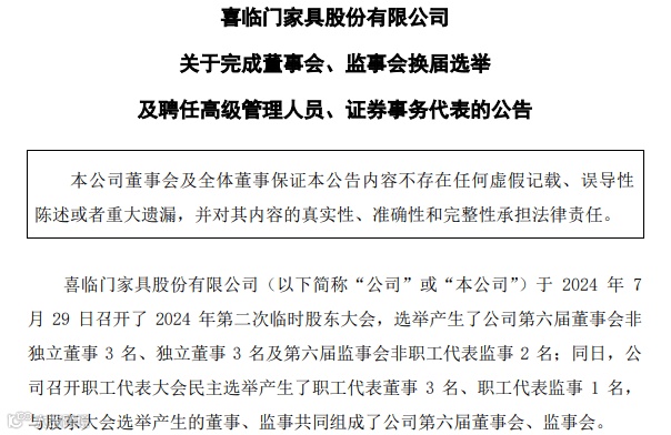 7月29日,喜临门家具股份有限公司发布公告,宣布公司董事会和监事会换届选举完成,并聘任了新的高级管理人员及证券事务代表。
