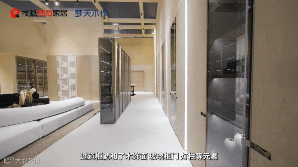 过道柜巧妙融合木饰面、玻璃门与灯光等多种元素,亚克力罗马柱散发柔和光芒,空间层次跃然眼前。