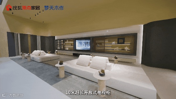 除了静奢系列外,雅奢系列也亮相展区。雅奢客厅内,10米超长开放式电视柜,通体采用祥云金雕刻背板,搭配玻璃壁挂层板,使整个空间更具层次感与立体感。多重材质工艺的叠加,诠释了超现代的中式奢华。