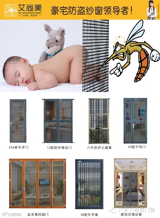 佛山市南海区纱三湾门窗有限公司将携豪宅防盗纱窗领导者--艾尚美知名品牌出席2014年7月8-11日在广州保利馆举办的广州建筑遮阳及门窗纱窗展览会。展位号为:1D026。艾尚美真诚邀您相约广州保利馆,一起探讨纱门窗防蚊、防盗知识。展会现场抢眼的户外玻璃幕墙广告、桁架广告、吊带广告等一系列广告,诠释了艾尚美雄厚的实力。
