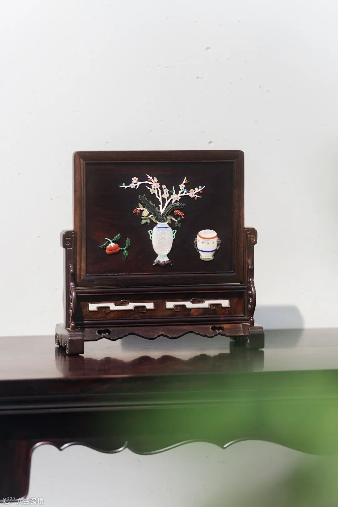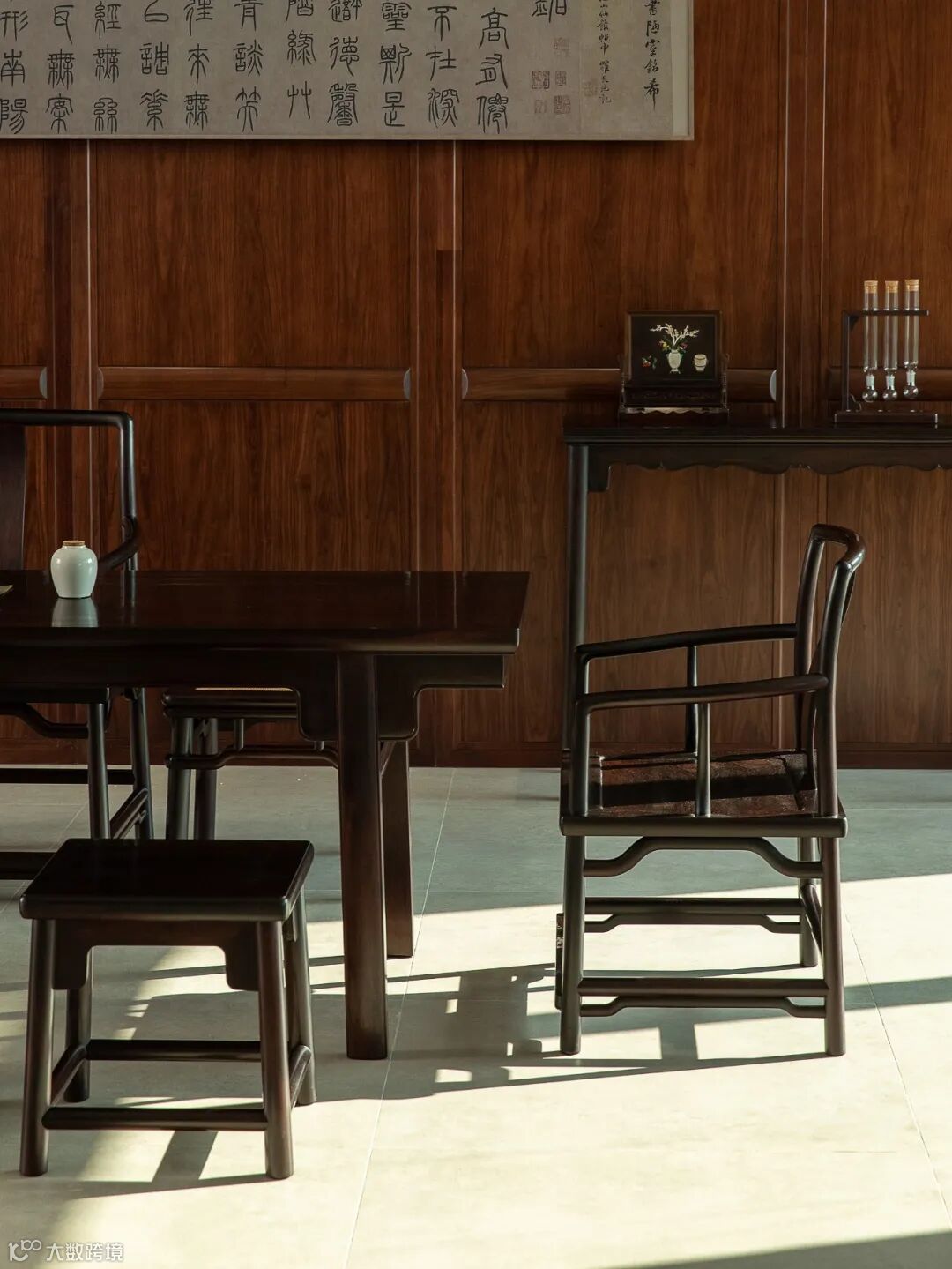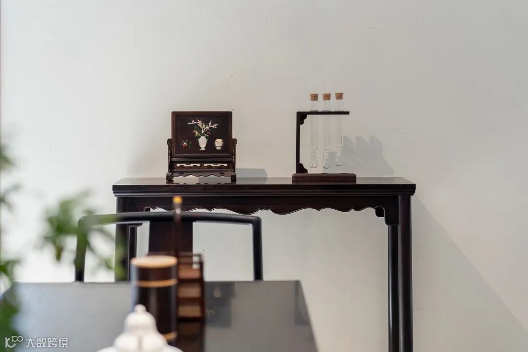 在空间中搭配精美的酸枝百宝嵌插屏、灵动秀美的高提梁提篮、藏玩手把件等物件,深藏的文化气息与时光质感呈现出含蓄有致的东方美学魅力。