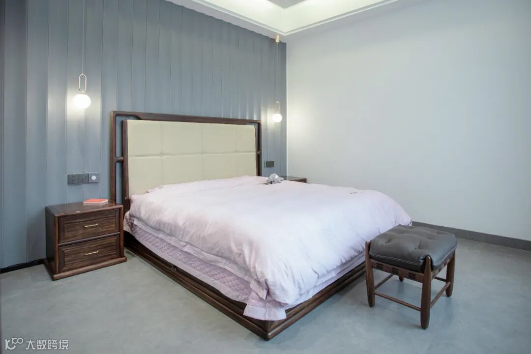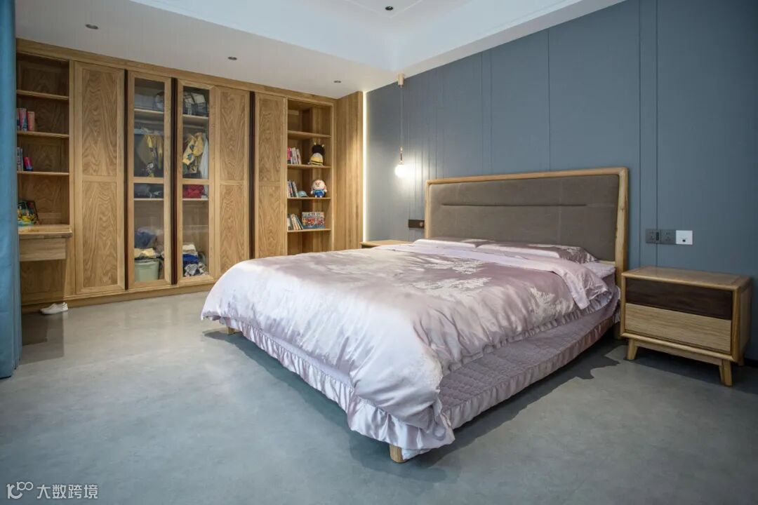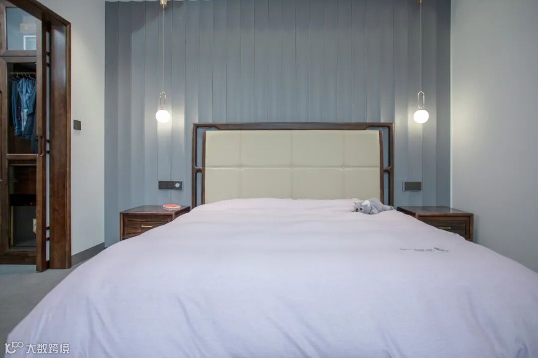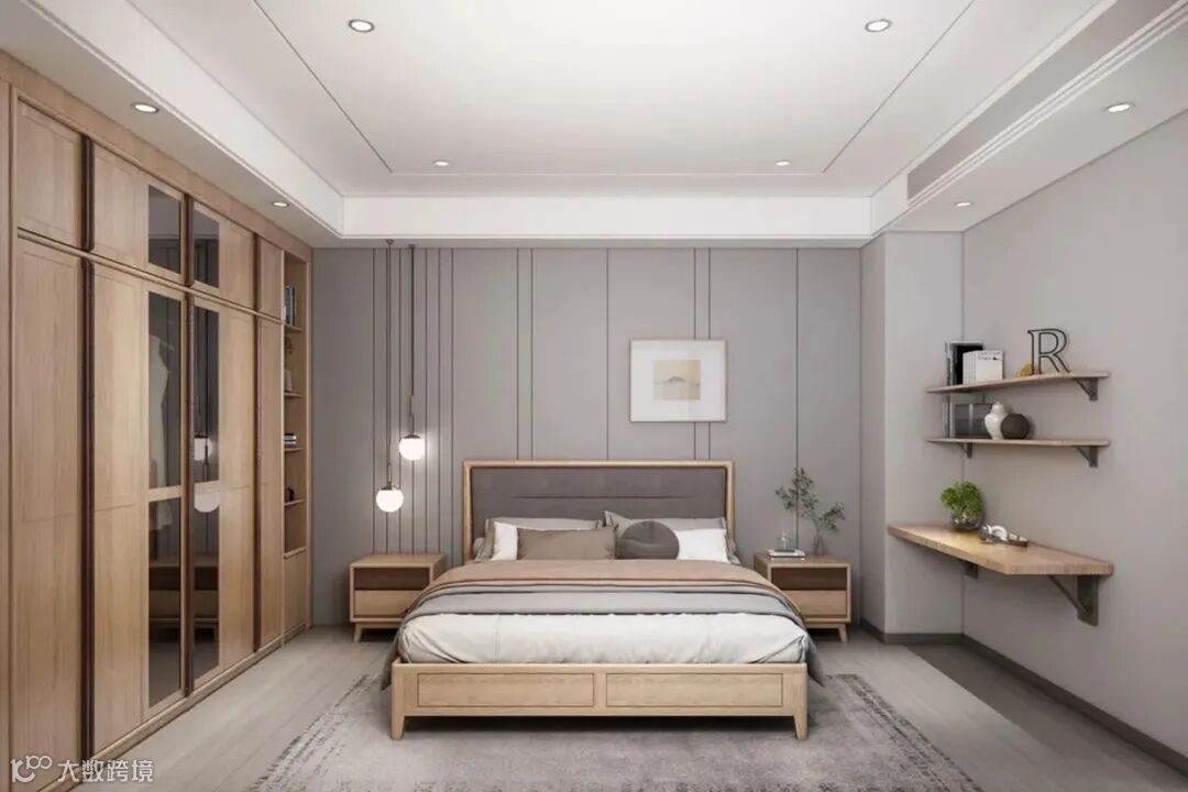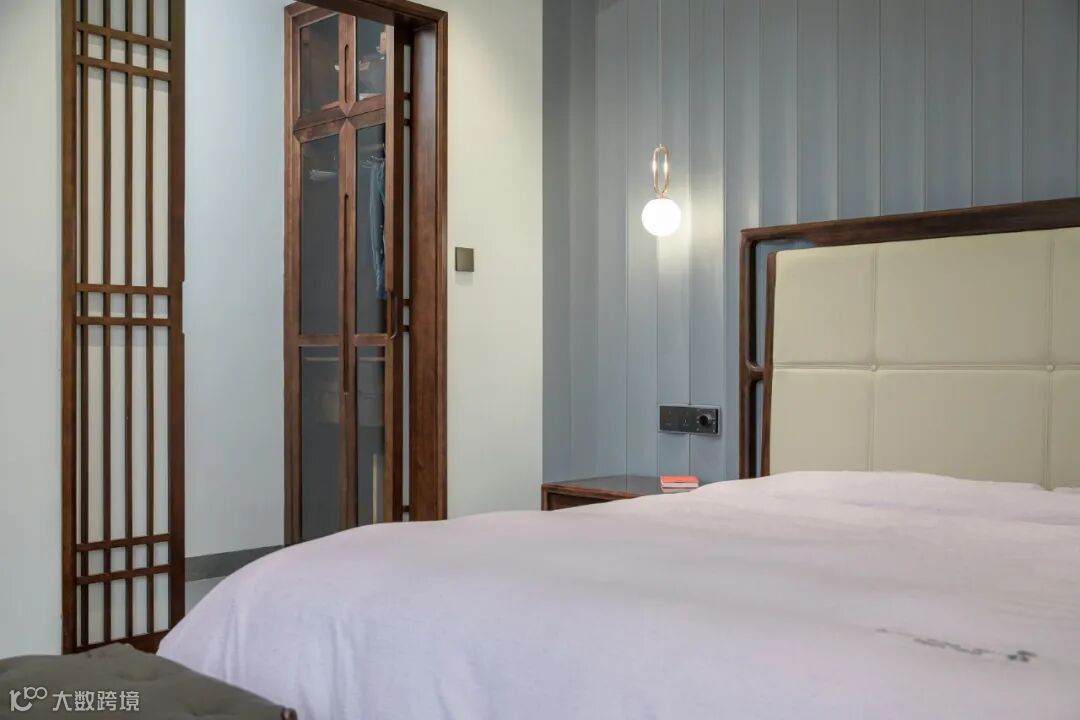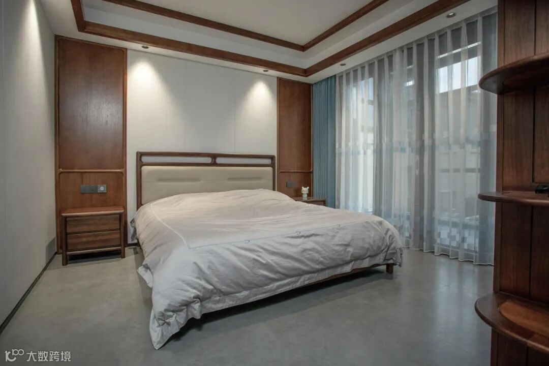 老人房首要的是安静与温和,木材选择温润的胡桃木,胡桃木色十分醇厚,软装色调上以高级灰、素雅白等作为辅助,整体氛围静谧舒缓。
