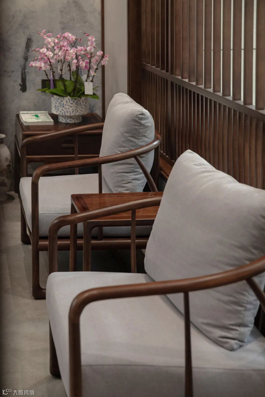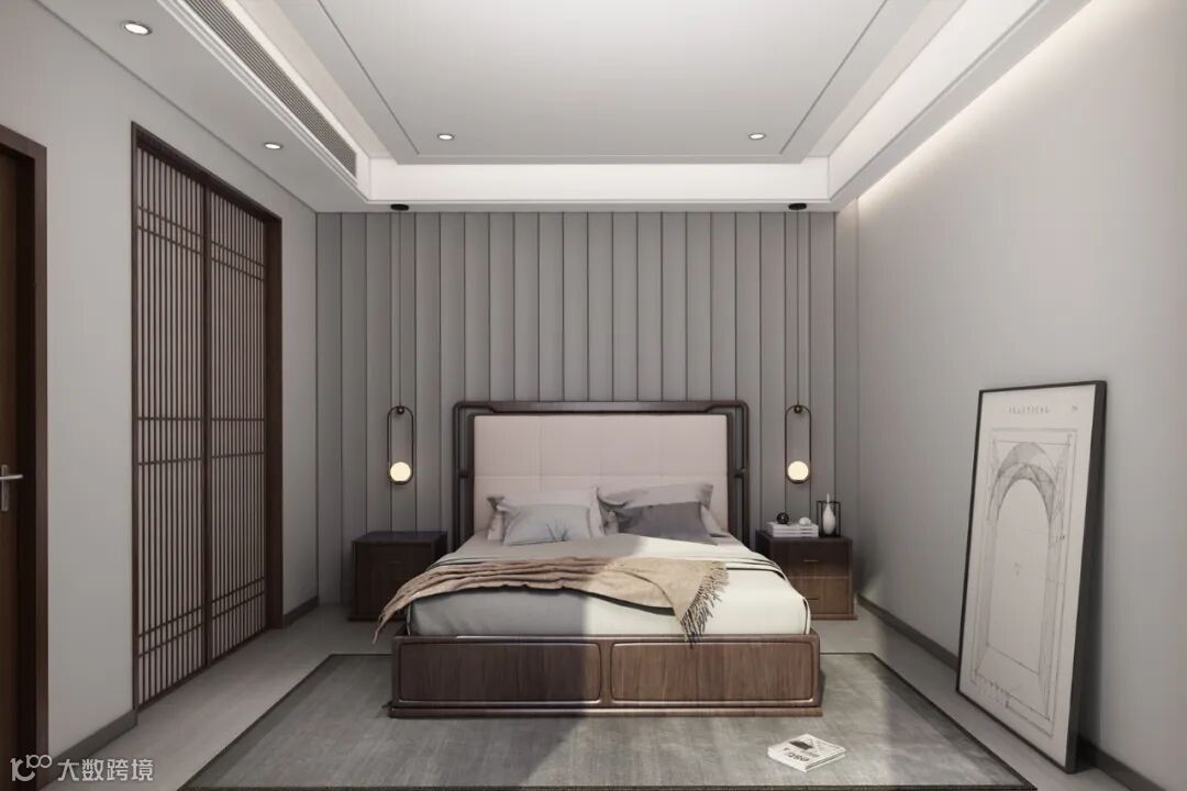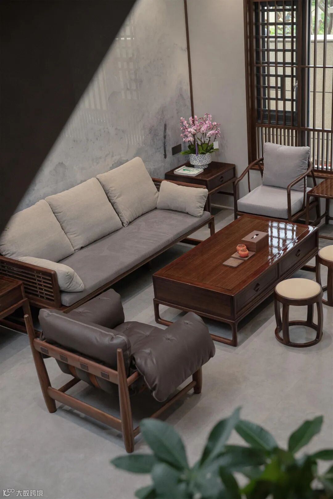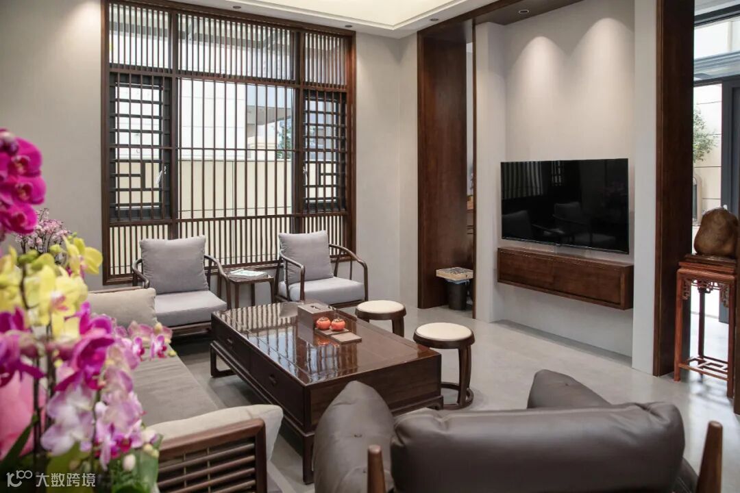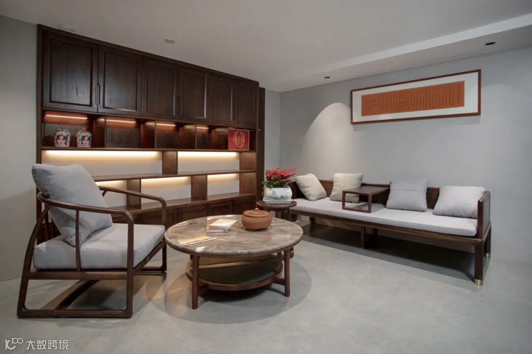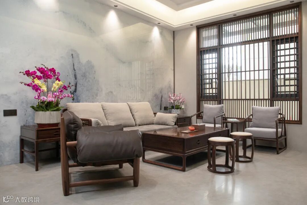 黑檀木的沙发质感,简洁的木线条与通透的窗格栅,在光影中描摹出“木头”的温暖属性与自然生长的痕迹,呈现着极简的东方美学意象。