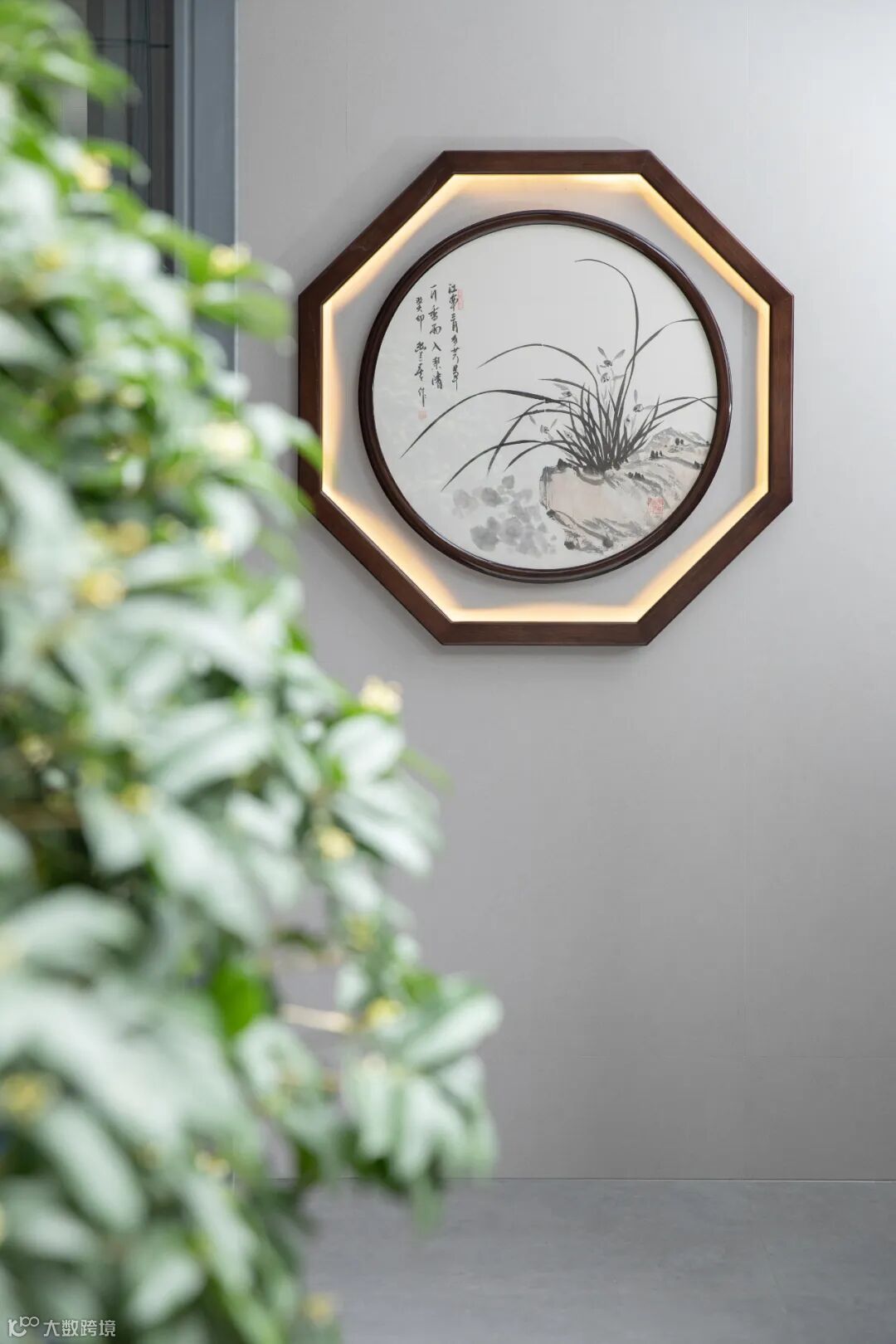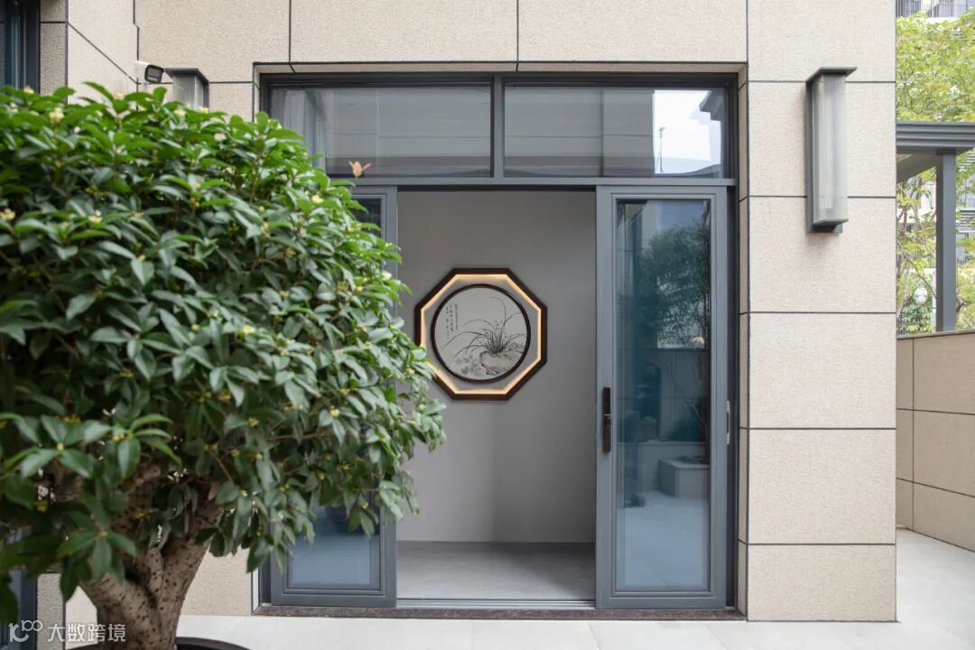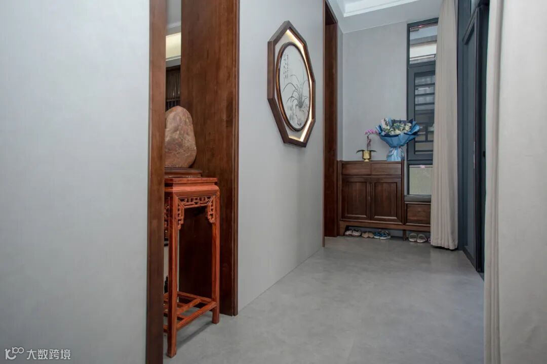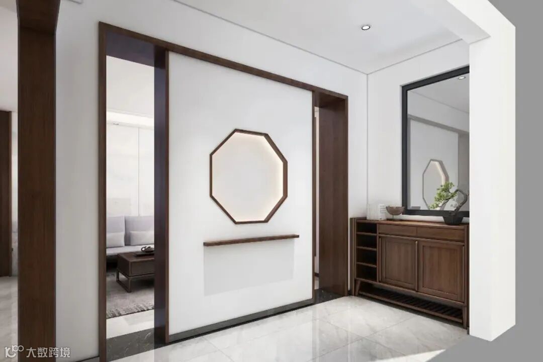 入户玄关设计参考了《易经》中阴阳五行的风水意象,隔断墙与客厅空间的电视背景墙一体式,墙上嵌入八边形,以画入局,天地方圆顺应中国传统建筑设计讲究。